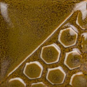 Kägla 6 oxidation (1240 °C): Färgen ändras till en halvtransparent, flammig guld-/kräm-/brun ton som bryter över struktur och samlas i krämvita partier. Ökad rörlighet. Ytproblem kan förekomma.
