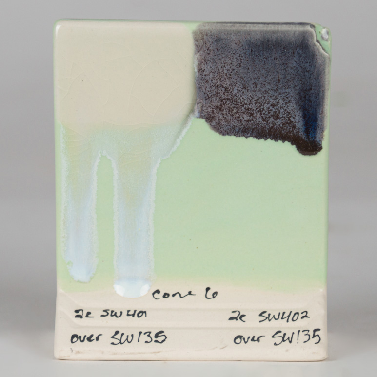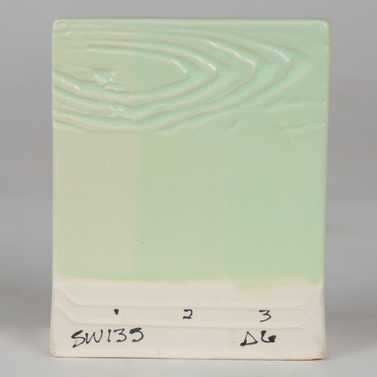 Kägla 6 oxidation (1230°C): Wintergreen är en ljusgrön, semi-ogenomskinlig satinmatt glasyr vid kägla 6. Lättare lager låter kroppsegenskaper synas genom glasyren (särskilt på mörka och fläckiga lerkroppar). Använd tre lager för att uppnå den djupaste ogenomskinligheten.