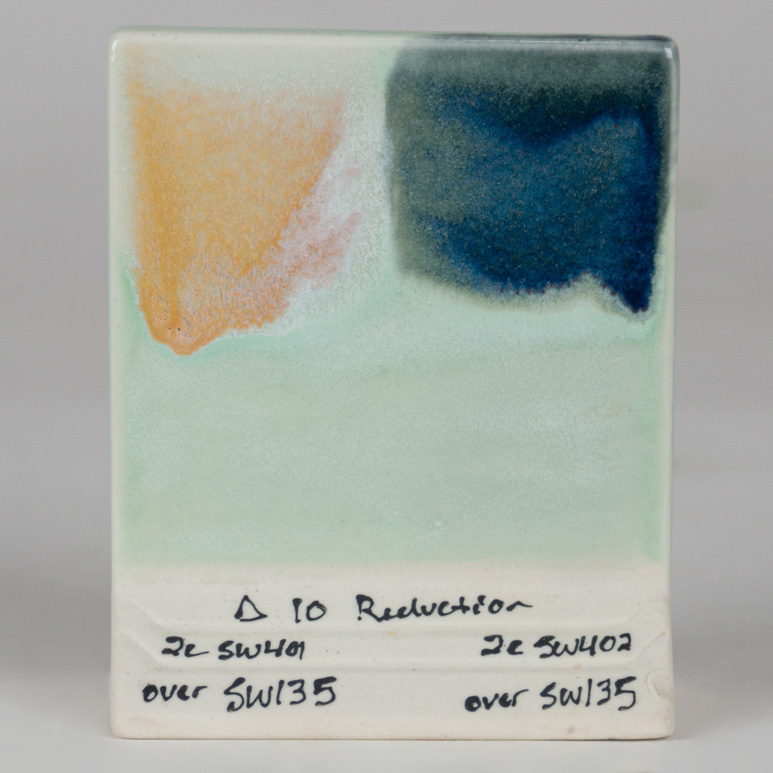 Kägla 10 reduktion (1280°C): Färgen ändras till en transparent blekgrön glans med matt kristalltillväxt.